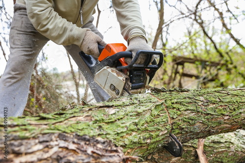 lumberjack sawing a tree trunk with a chainsaw close up. sawdust fly from a chainsaw