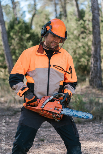 Lumberjack using chainsaw in forest