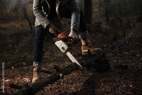 Lumberman work with chainsaw sawing a tree in the forest. Lifestyle work. Male hands with a saw in the woods. Detail . Hard work with a saw.