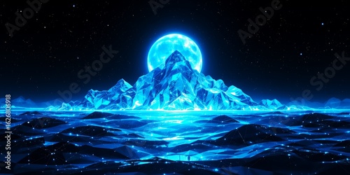 Luminous blue abstract crystalline mountains under a full moon and starry sky