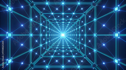 Luminous blue grid tunnel with glowing nodes abstract
