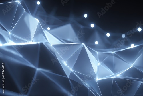 Luminous Blue Polygonal Network with Glowing Nodes on a Dark Abstract Cyberspace Background.