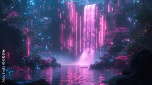 Luminous cascade reflecting in tranquil pool surrounded by vibrant vegetation at night
