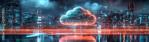 Luminous Cloud Icon Illuminating a Futuristic Cityscape Digital Art Nighttime Environment Wide-Angle Viewpoint