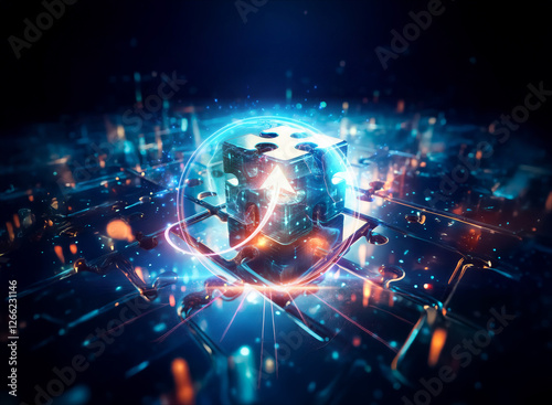 Luminous cube with upward arrow, encircled by glowing blue and orange lines/shapes on dark backdrop. Futuristic technology concept.