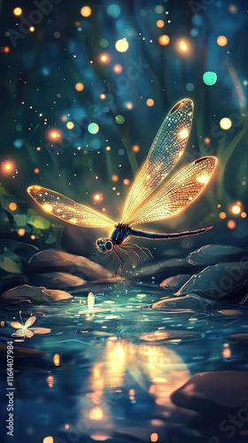 Luminous Dragonfly Over Still Water At Night