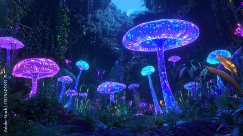 Luminous Fungi Fantasy: A mesmerizing view of a forest floor, populated with radiant, otherworldly mushrooms glowing with vibrant purple, blue, and turquoise light.