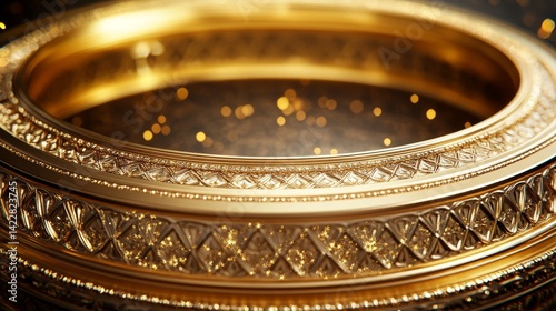 Luminous golden ring frame with detailed relief patterns, modern geometric arabesque design, dimensional depth with floating glitter particles, sophisticated metallic texture with micro-details,