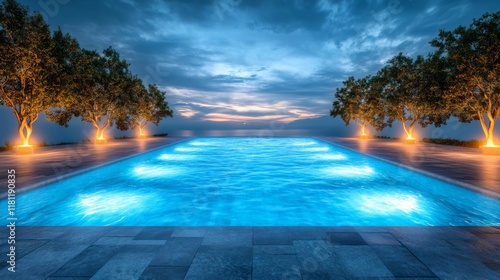 Luminous pool at night, a tranquil oasis surrounded by trees and underwater lights
