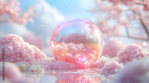 Luminous sphere rests on pink floral blossoms reflecting the scene and sky A serene dreamlike quality is created by t