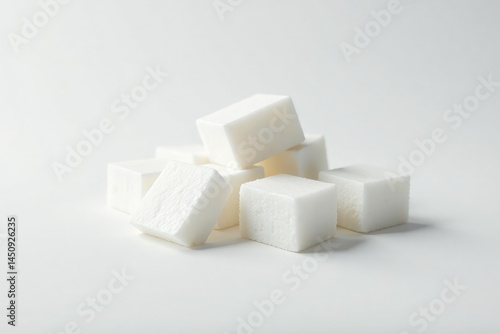 Lumps of refined white sugar against white backdrop, recipe, isolated