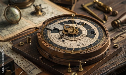 lunar calendar, a close-up of a handcrafted lunar calendar made from wood and brass