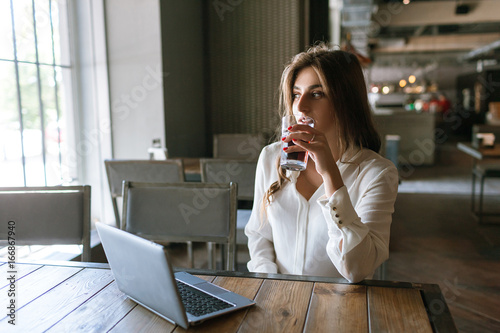 Lunch break during work. Thoughtful business lady. Freelancer in cafe, busy workaholic girl