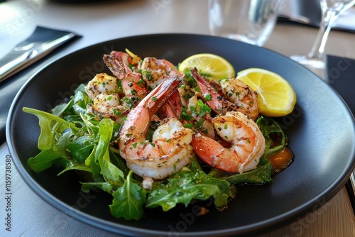 Lunch features grilled shrimp and fresh salad