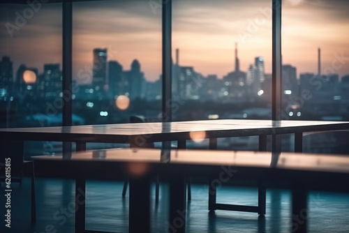 lurred office workspace in the evening , interior workplace with cityscape for business presentation background. Generative AI