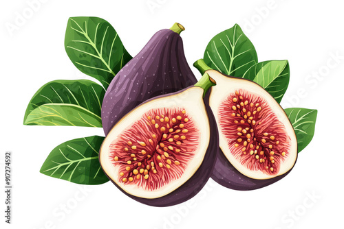 Luscious fig halves with leaves floating,white background, high in fiber and minerals