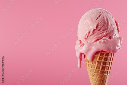 Luscious Melting Pink Ice Cream in Waffle Cone, Summer Treat on Light Pink Background - Summery Delightful Dessert Concept