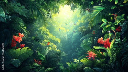 Lush and Exotic Rainforest with Dense Foliage and Vibrant Colors