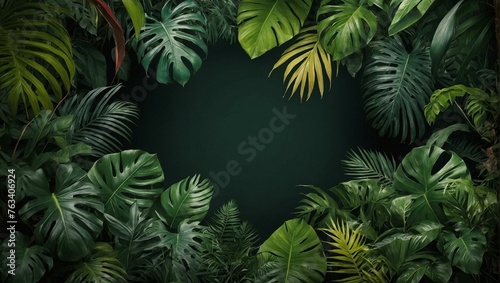 Lush and exotic tropical leaves of various shapes and shades of green create a natural frame around a central dark space