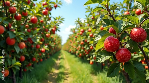 Lush apple orchard with rows of trees laden with ripe red apples under a bright sky.