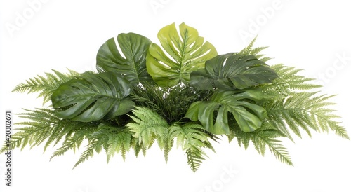 Lush arrangement of artificial tropical foliage, featuring ferns and monstera leaves