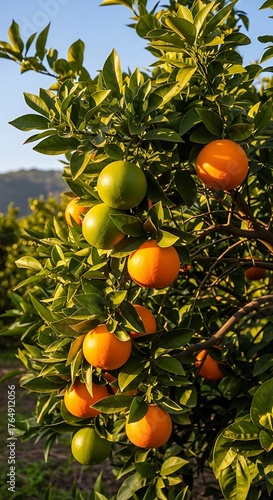 Lush citrus orchard displays vibrant oranges and limes on a sunny day.