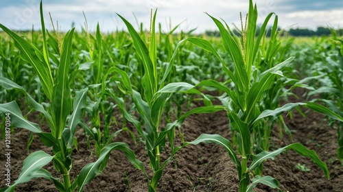 Lush Cornfield With Growing Stalks Under a Partly Cloudy Sky