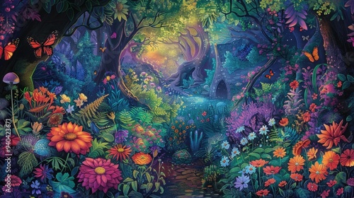 Lush enchanted garden filled with vibrant flowers and whimsical creatures, capturing the magic of a mystical sanctuary.