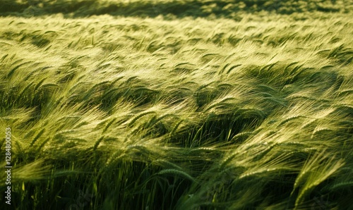 Lush field of wheat swaying gently under soft golden sunlight, creating a serene and natural countryside composition