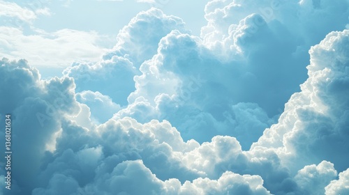 Lush, fluffy clouds fill the vast sky, illuminated by sunlight.