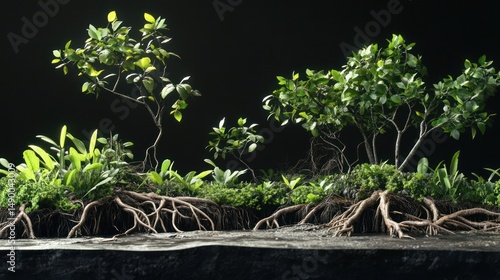 Lush foliage, exposed roots, dark background; environmental conservation