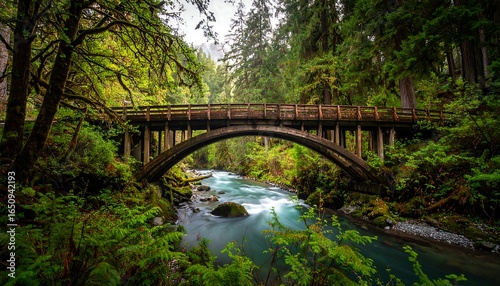 Lush forest river arch bridge