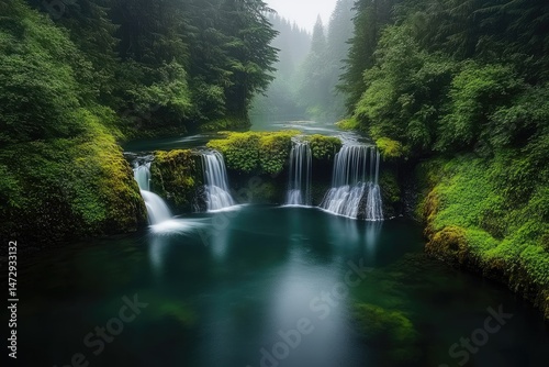 Lush forest waterfall, tranquil river