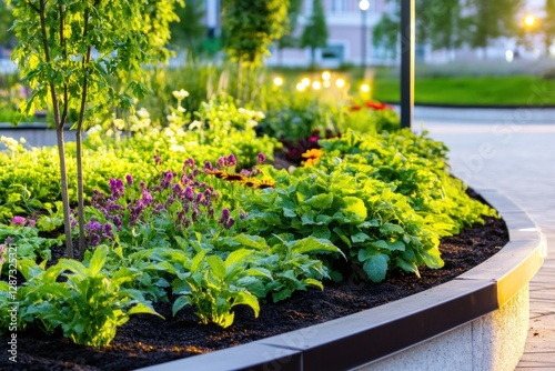 Lush garden bed features a variety of colorful flowers and vibrant greenery in a well-maintained urban park during evening hours