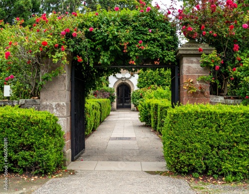 Lush Garden Pathway Framed by Blooming Flowers and Greenery