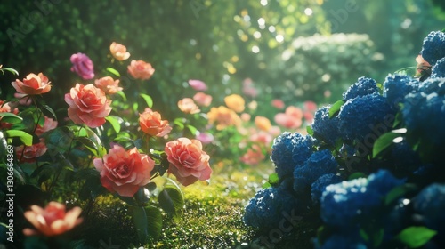 Lush garden with roses and hydrangeas, vibrant and fragrant, ultra-detailed, 4k