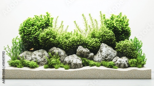 Lush green aquatic plants and grey rocks arranged on light beige sand in a rectangular container.