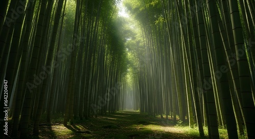 Lush Green Bamboo Forest with Sunlight Filtering Through Tall Stalks