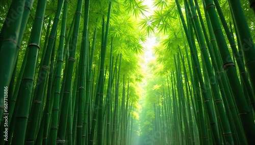 Lush green bamboo stalks in a dense grove, sunlight filtering through the leaves, creating a serene and peaceful atmosphere Perfect for nature, zen, and environmental themes , ecology, zen