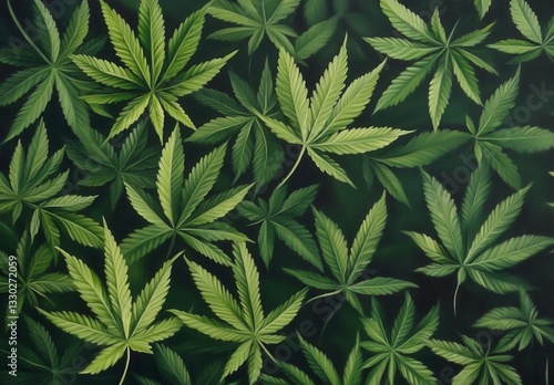 Lush green cannabis leaves spread across a dark background, showcasing various shapes and sizes in a vibrant, natural pattern.
