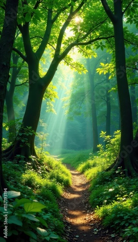 Lush green canopy, sunlight dappled forest floor, fresh, rich