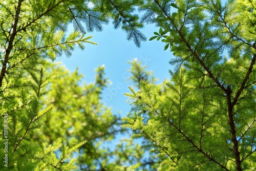 Lush Green Coniferous Branches Sunny Sky Nature Background