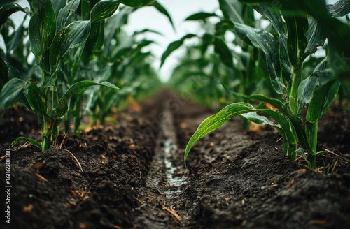 Lush green corn plants stretch tall in rows, with sunlight illuminating the field under a clear sky. The soil is rich and well-tended, indicating healthy growth in early summer.
