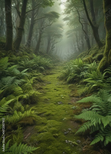 Lush green ferns and moss carpet forest floor , plants, jungle