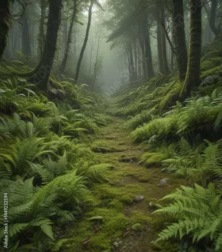 Lush green ferns and moss carpet the forest floor , leaves, outdoor, earthy