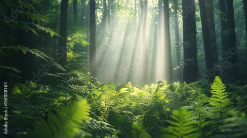 lush green ferns covering the forest floor, blurred background of towering trees,