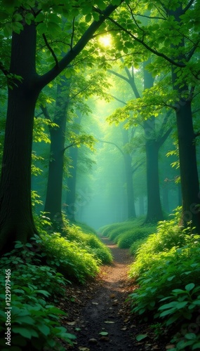 Lush green foliage covering the forest canopy, serenity, atmosphere