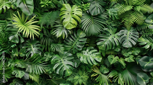 Lush green foliage creates vibrant and serene atmosphere, showcasing variety of tropical leaves that evoke sense of tranquility and natural beauty