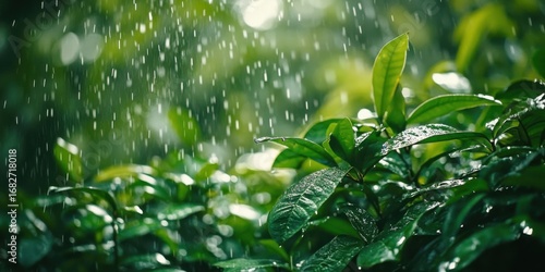 Lush green foliage, glistening with rain drops, bathed in soft sunlight filtering through a light rain shower.