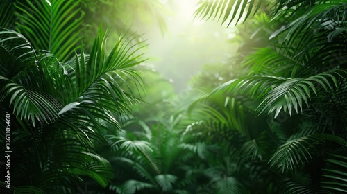 Lush green foliage in a vibrant jungle, illuminated by soft sunlight, creates a tranquil and serene atmosphere.